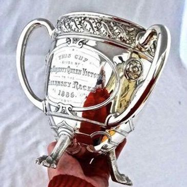 This is an image of a 1.2kg silver trophy, given to the Island by Queen Victoria in 1886 and later purchased & donated back to the Guernsey Museum by the Seigneur de Fantôme.